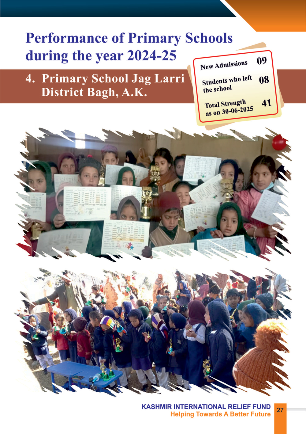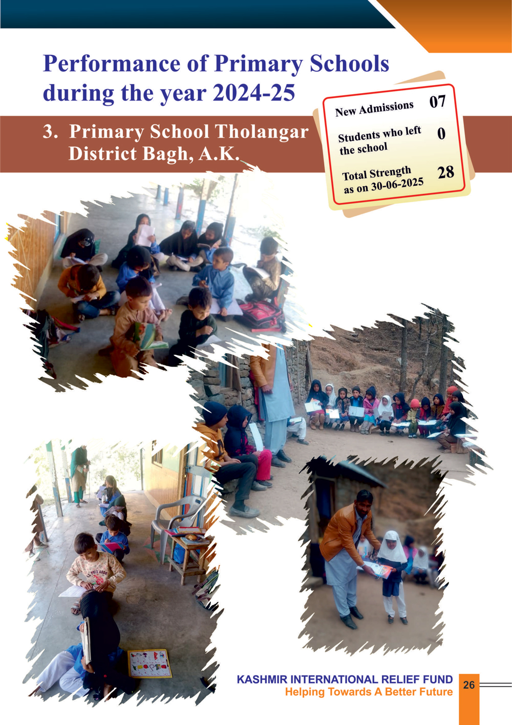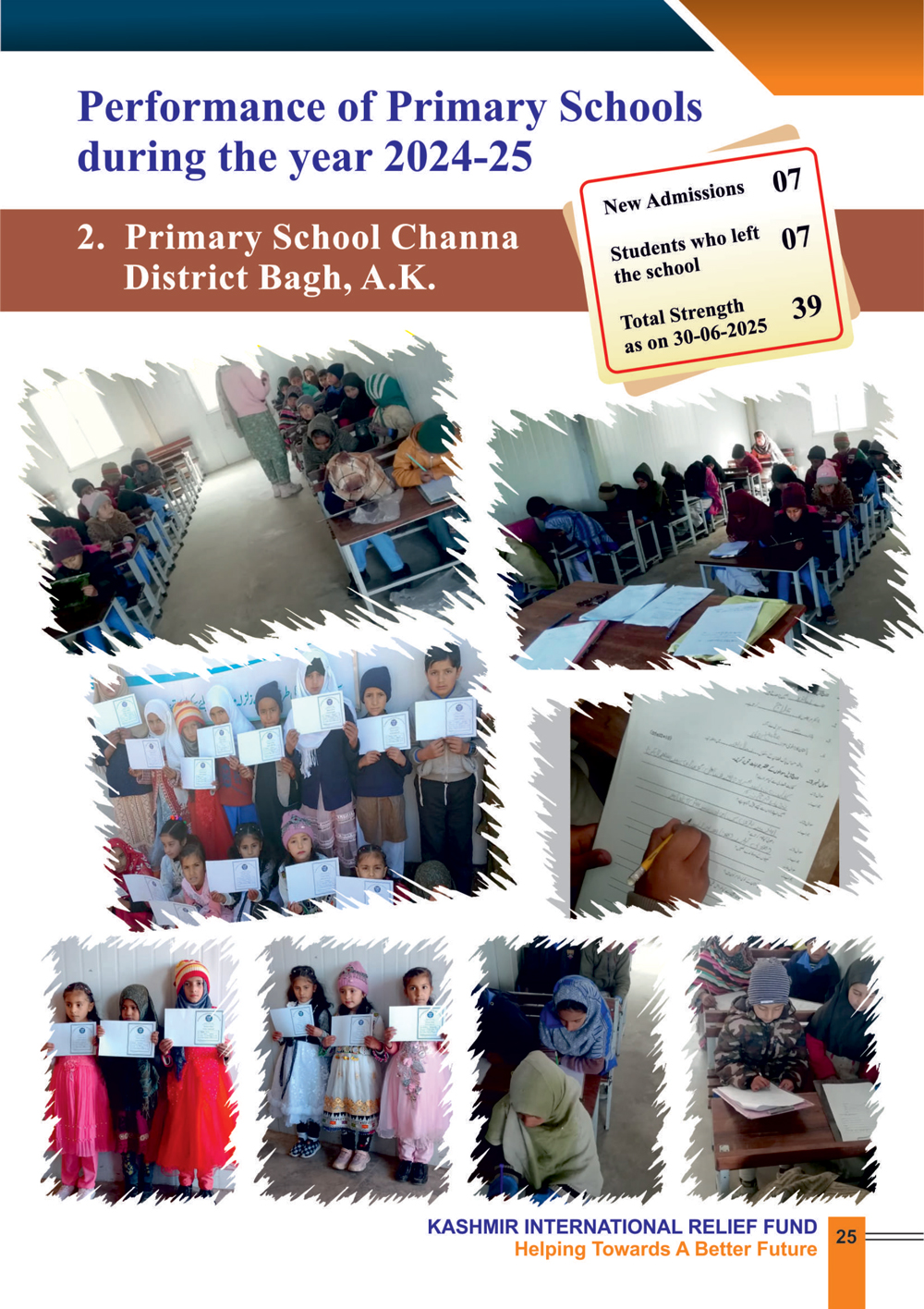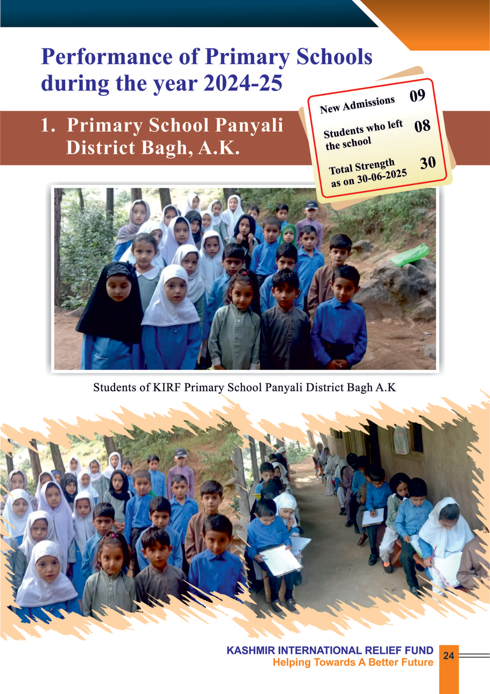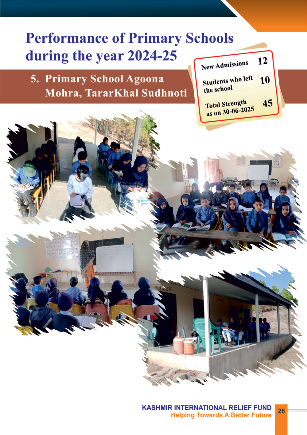 By prioritizing primary education, KIRF is committed to creating a brighter future for the children of Azad Jammu and Kashmir. During the year 2024-25, KIRF continued to operate the following five primary schools.